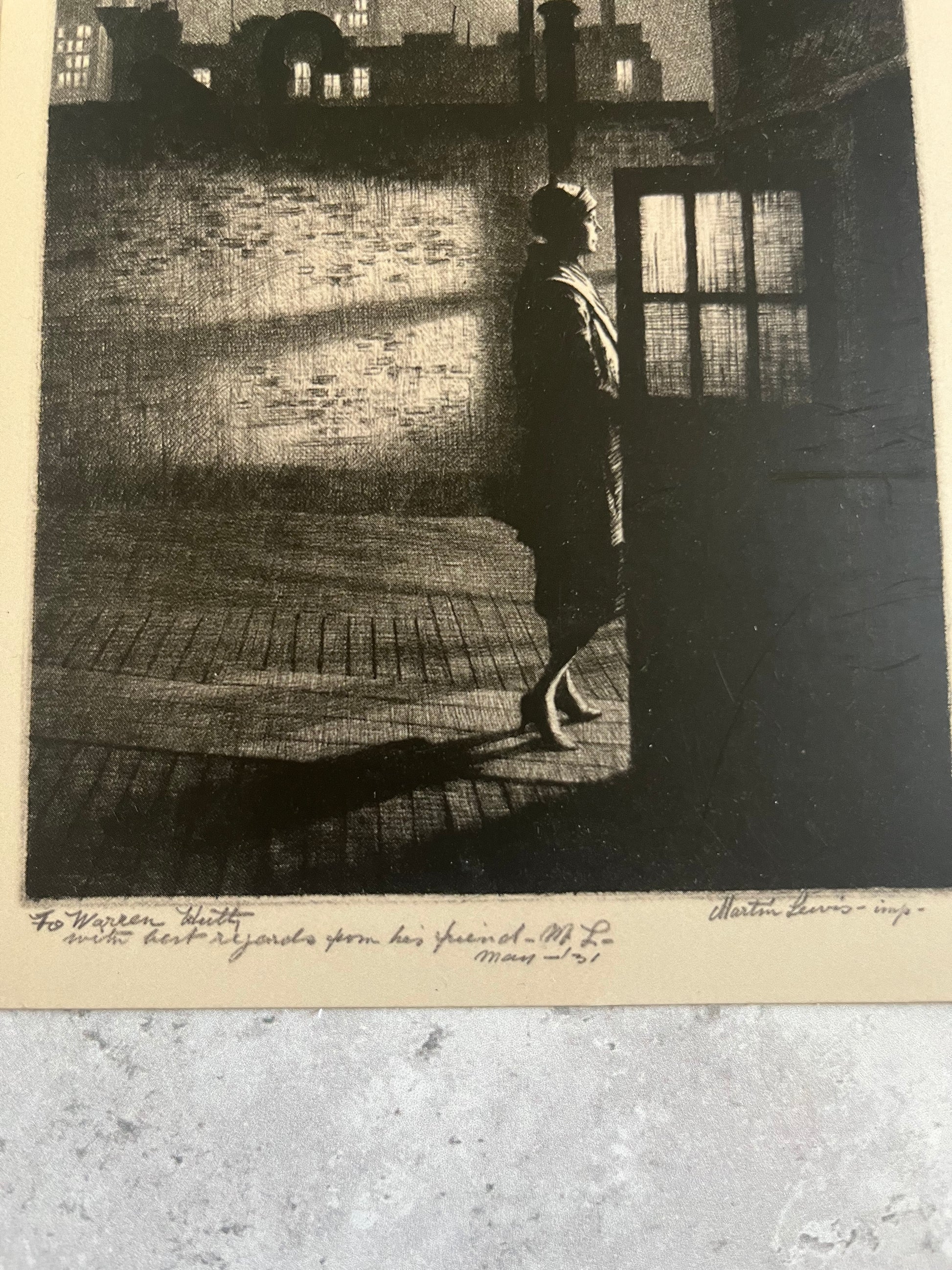 ‘Little Penthouse’ is a drypoint etching created by Martin Lewis in 1931, a very commercially successful artist, ‘Little Penthouse’ was created in what is widely identified as his peak. His work showing everyday tasks and working people of New York through the 1920s and 1930s captures the often accidental beauty in these moments.