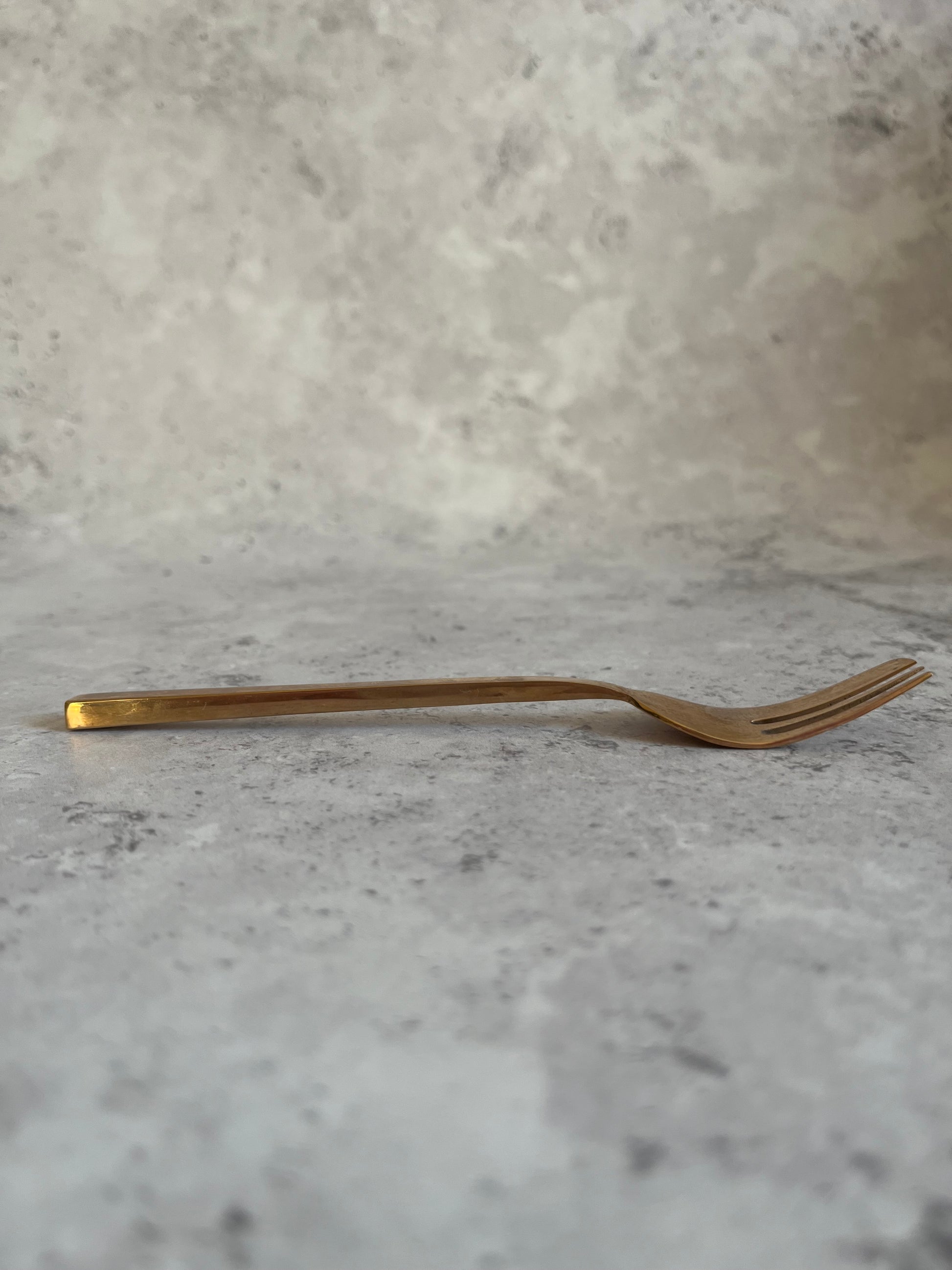 Setting a gorgeous statement at your dinner table, this vintage set of six cake forks have a lovely angular profile and a bright golden colour. I believe them to have been made in the 1960’s in Thailand and the colour has kept very well over the years. Each fork measures at approximately 15cm in total length and is a brilliant example of mid century modern style.