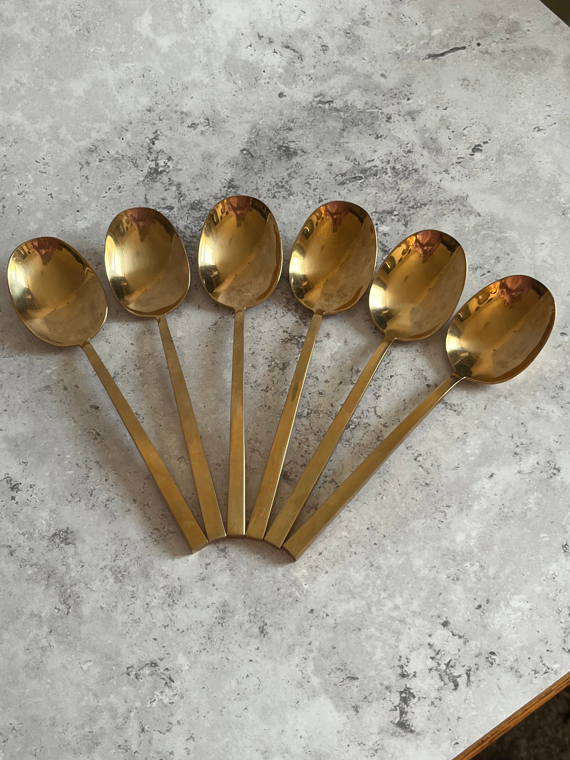 Setting a gorgeous statement at your dinner table, this vintage set of six table spoons that have a lovely angular profile and a bright golden colour. I believe them to have been made in the 1960’s in Thailand and the colour has kept very well over the years however there is some slight discolouration as shown in the photos. Each spoon measures at approximately 18.5cm in total length and is a brilliant example of mid century modern style.