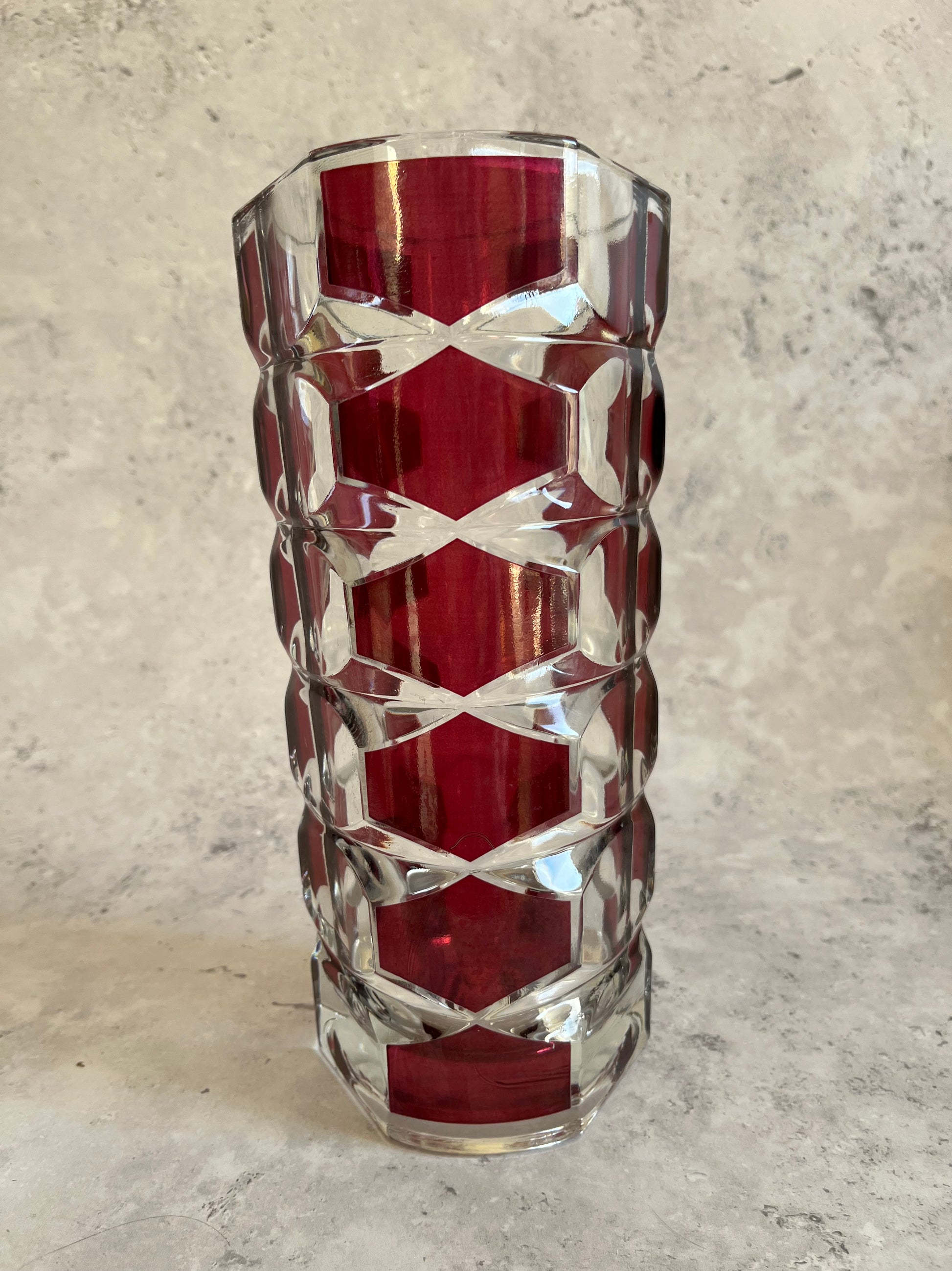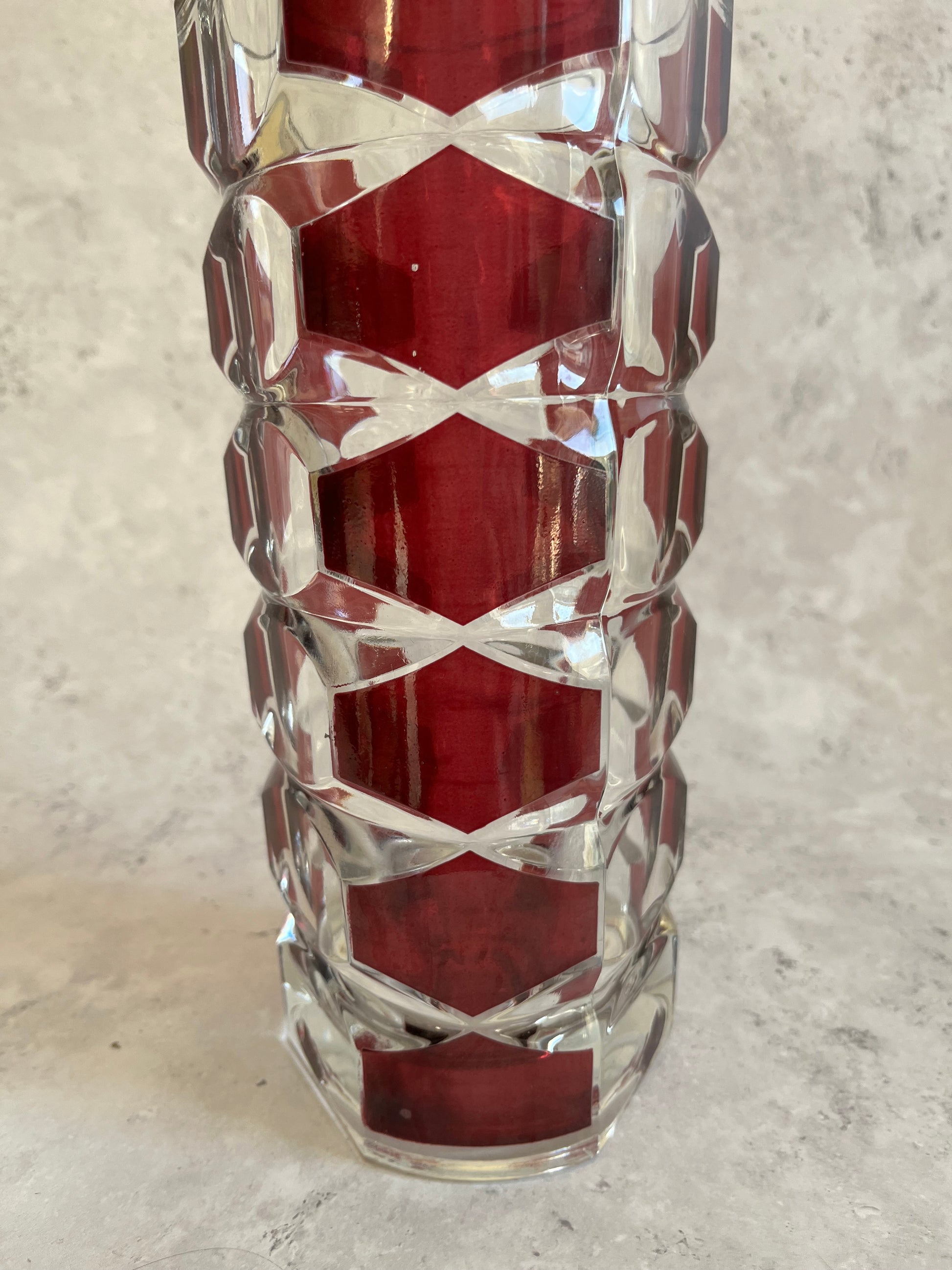 A clear and red pressed glass vase cut into a faceted geometrical shape and measuring at approximately 24cm high, this vase is an excellent addition for any dinning or hall table!
